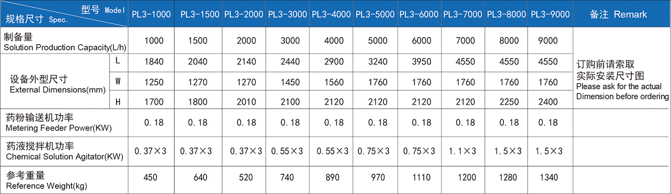 A PL3 automatikus három dobozos por előkészítő rendszerét oldó tartályra, kanyargós tartályra és tárolótartályra osztják. Ez manuálisan vagy automatikusan vezérelhető. A rendszer kompakt szerkezetű, automatikusan működtethető, és az előkészítési koncentráció állítható.